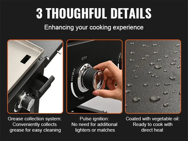 User-friendly Design: Thoughtful details are designed to make your outdoor cooking experience more enjoyable. The drip holes direct excess oil, water, and residue towards the oil cup, and the oil collection system allows you to collect grease more effectively, relieving you from the hassle of cleaning. The one-touch pulse ignition ensures safer and simpler cooking, and the grill plate is coated with vegetable oil to prevent rust.