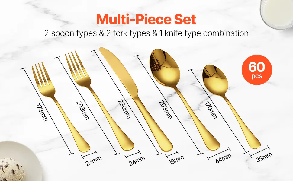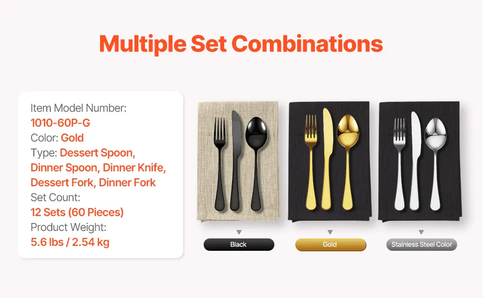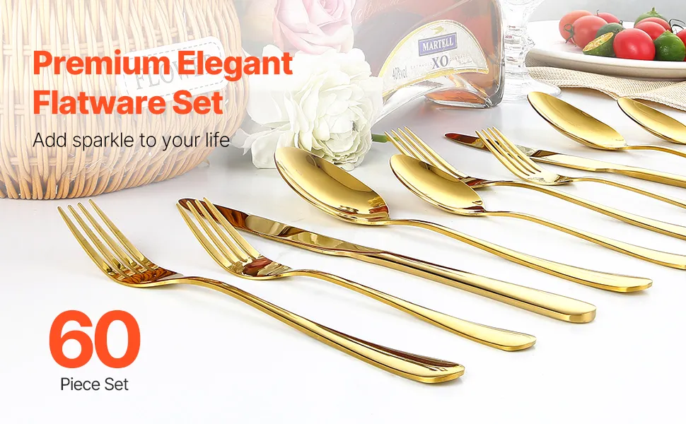 60-Piece Flatware Set: This silverware set includes 12 dinner forks, 12 dinner spoons, 12 dinner knives, 12 dessert forks, and 12 dessert spoons, making it an essential item for both home and restaurant use. Whether for everyday meals, dinner preparation, or parties, this flatware set is an indispensable dining tool