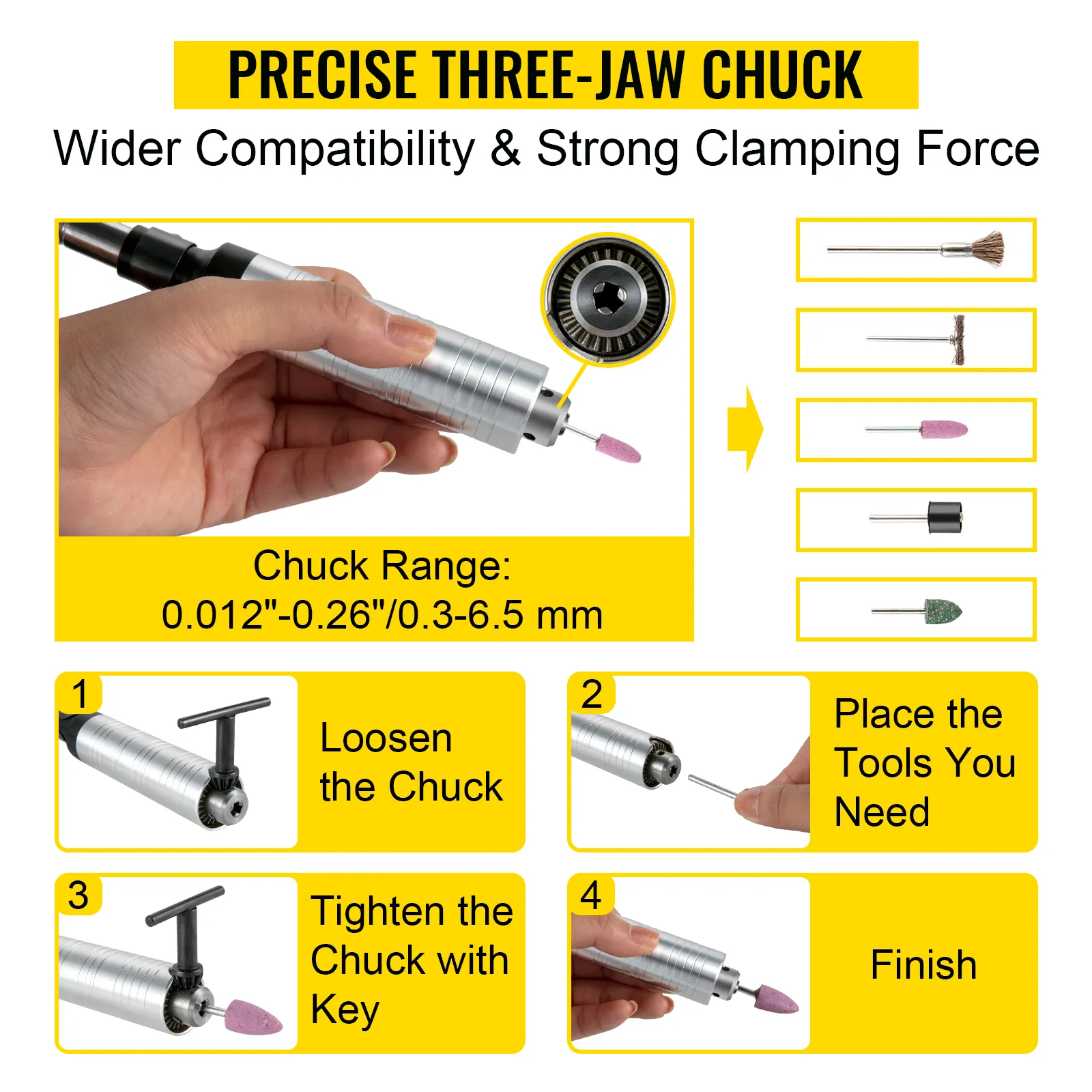 - Chuck Range: 0.3-6.5 mm / 0.012"-0.26"