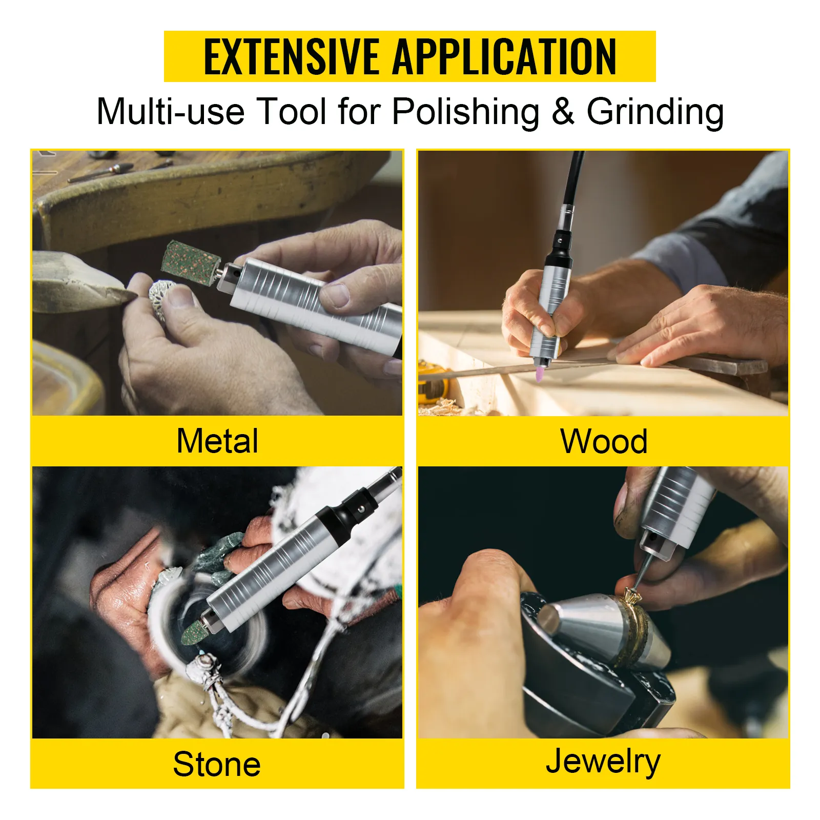Our flex shaft grinder comes with the complete accessory kit to perform numerous grinding, sanding, polishing, deburring, and cleaning tasks. With a strong copper motor, high-precision chuck, and variable speed foot pedal, the tool is suitable for different processing places and materials, such as metal, wood, stone, jewelry, etc.