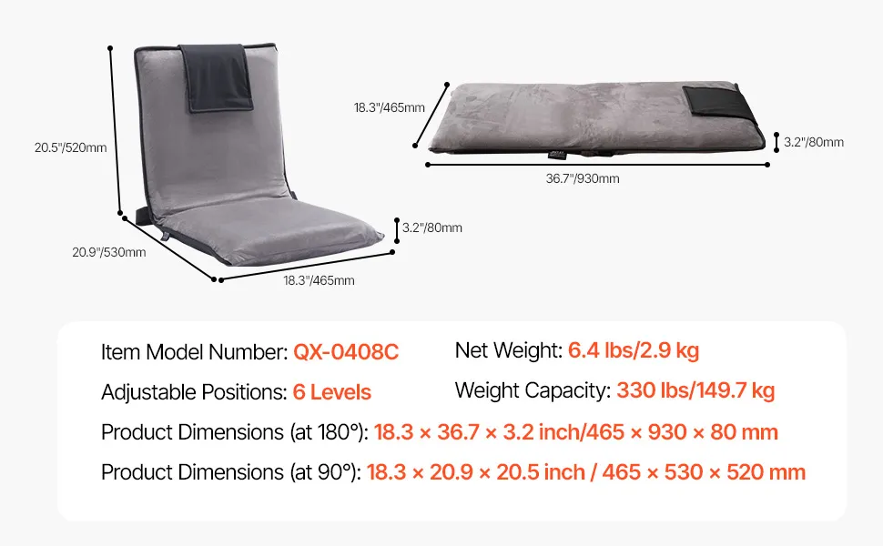 VEVOR Floor Chair, 6-Position Adjustable Meditation Chair with Back Support, Folding Sofa Chair for Reading TV Watching and Gaming, Portable Floor Seat Lounge Sofa Chair for Kids Teens Adults, Gray