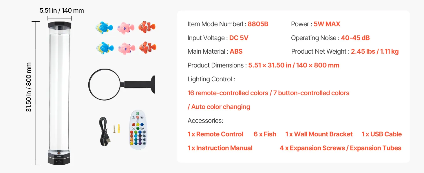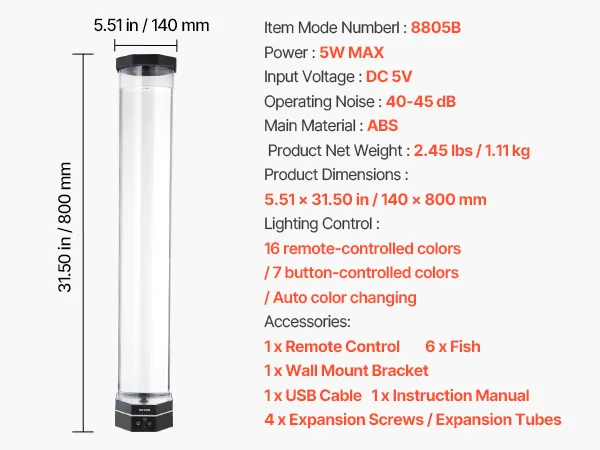 Anti-tip Design: Standing at 2.67 ft / 800 mm tall, this bubble tube lamp is ideal for creating ambiance in any room. The widened tube walls avoid fish warping, enhancing their realism. A sturdy base ensures stability, keeping it secure