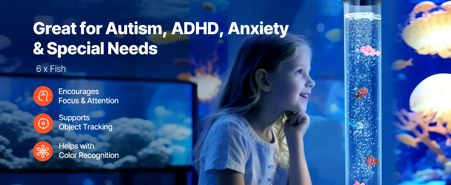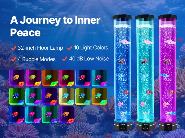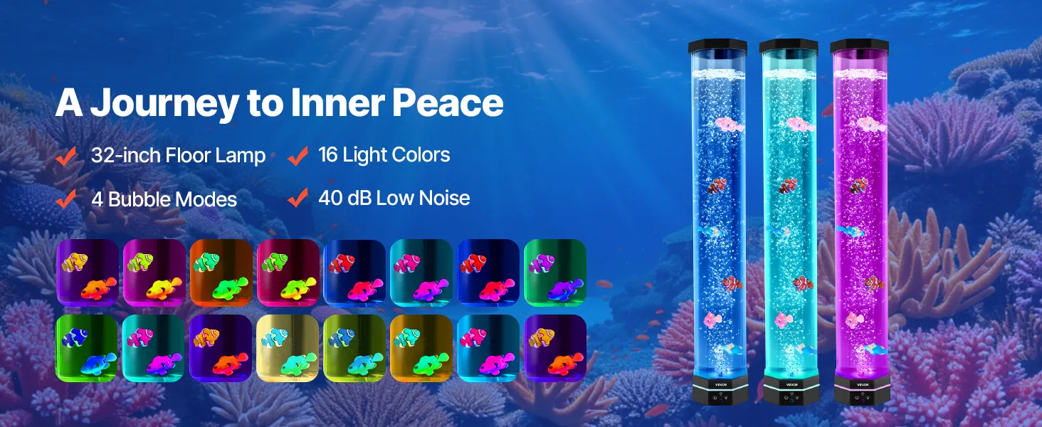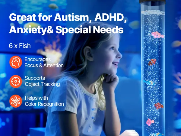 Floor-standing Bubble Lamp: This bubble lamp mimics underwater creatures' soothing movements, creating a calming ambiance with white noise. Ideal for those with autism, ADHD, or anxiety, it helps reduce stress and promote relaxation