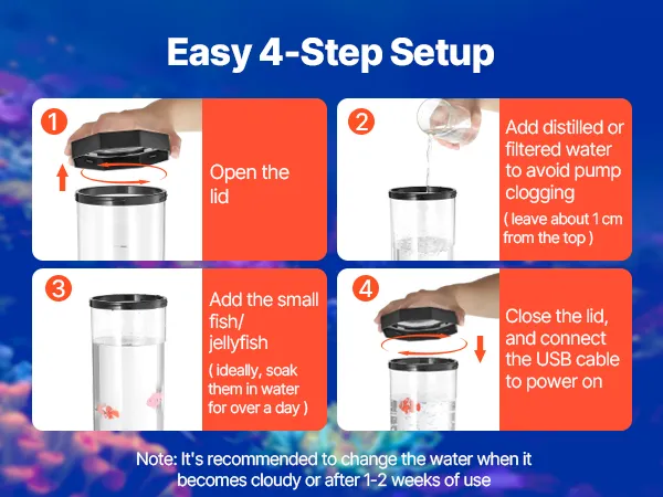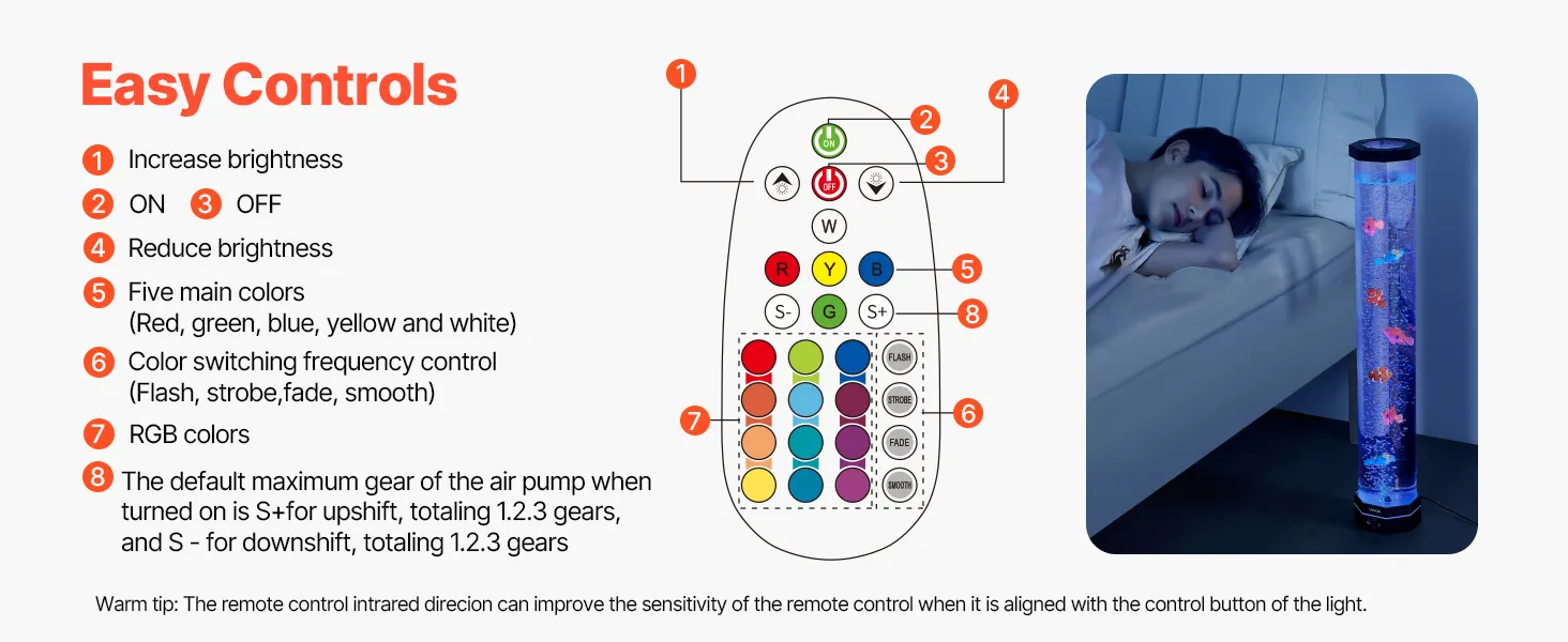 16 Color Lighting: Control 16 vibrant colors via remote or 7 color options with the built-in buttons. The bubble fish lamp also features automatic color changes. The lifelike jellyfish and fish, paired with varying lights, create a beautiful atmosphere