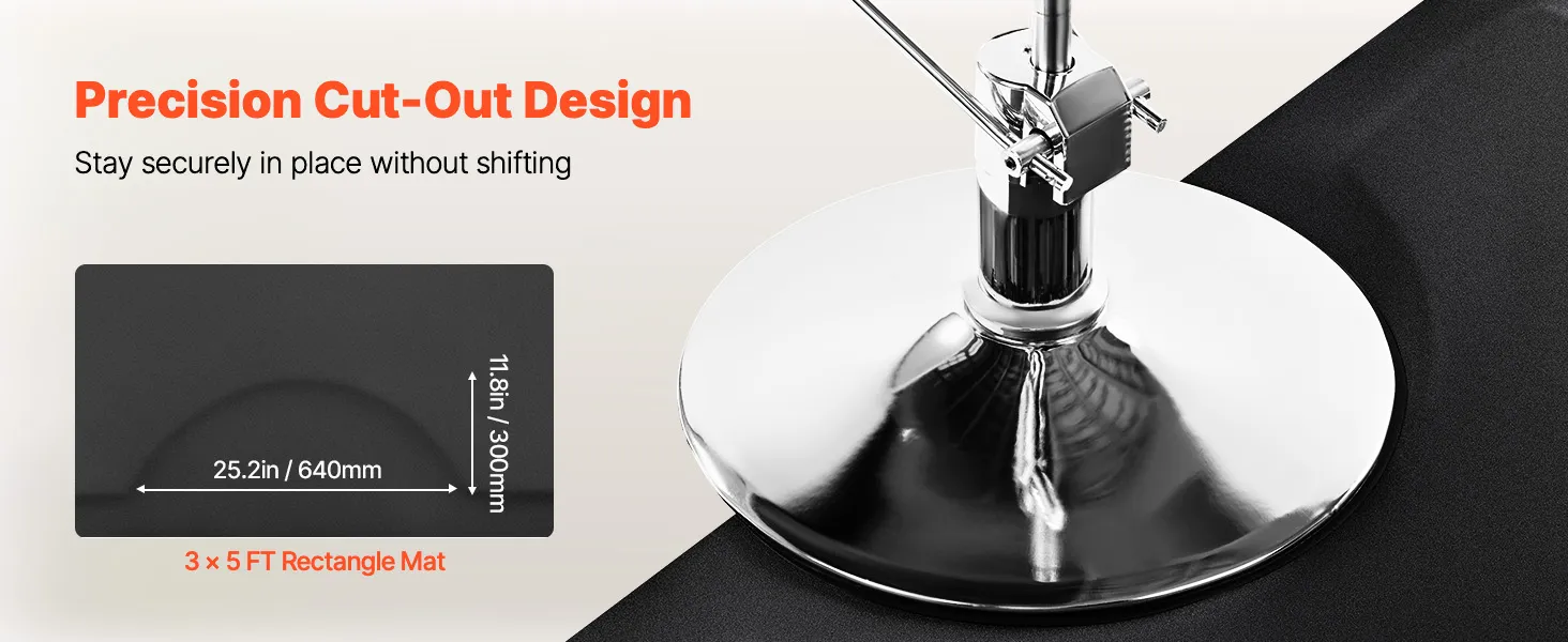 Large Size: Our 1525 x 910 mm rectangle salon mat for hair stylists offers a spacious standing area, allowing barbers to move freely and work more efficiently. The 25.2" x 11.8" (640 x 300 mm) cut-out fits most salon chairs with a round base, staying securely in place without shifting