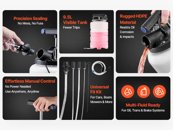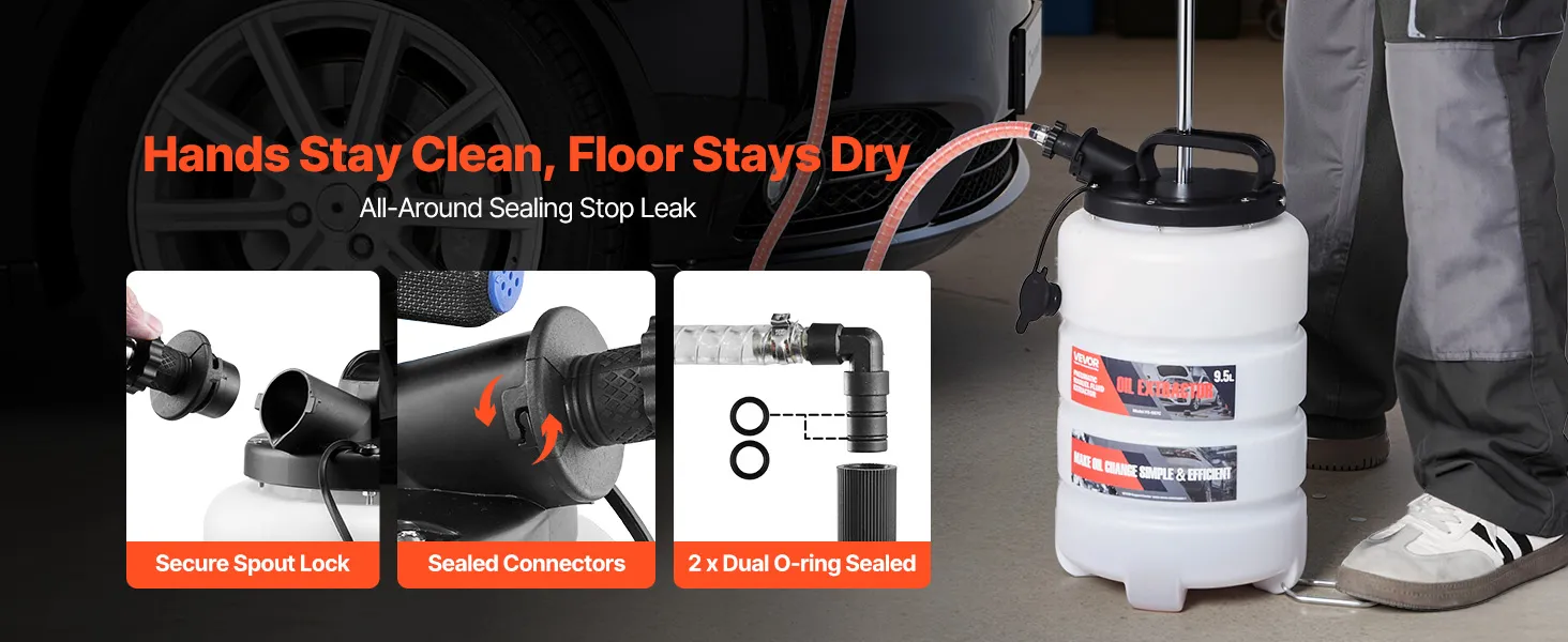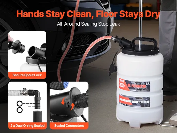 Air-Tight, No-Drip Seal: This fluid extractor uses a one-piece tank, precise O-rings, and sealed fittings to lock in air, cut leaks at ports and the base, and keep your workspace clean from start to finish