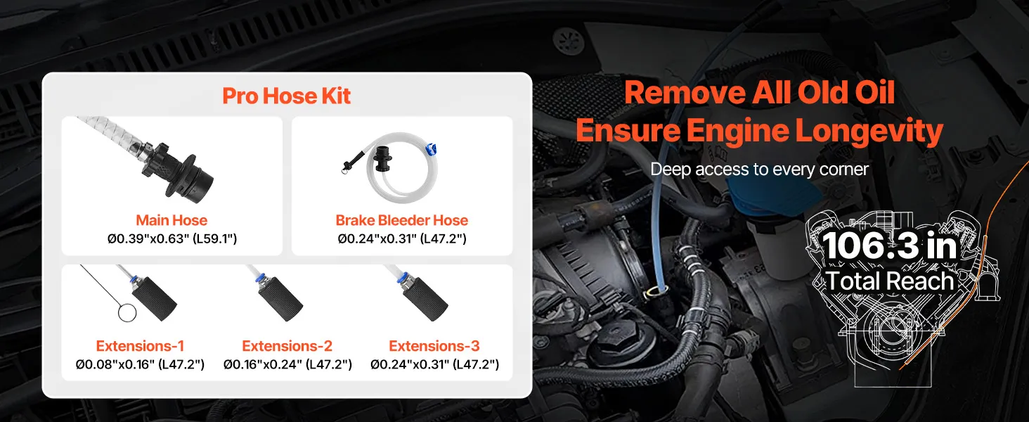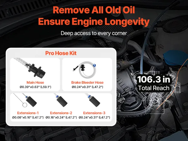 Multi-Size Hose Kit: This fluid extractor pump kit includes a main hose plus three extension tubes that reach deep into oil pans to grab leftovers, plus a dedicated brake-fluid hose for precise, targeted service tasks