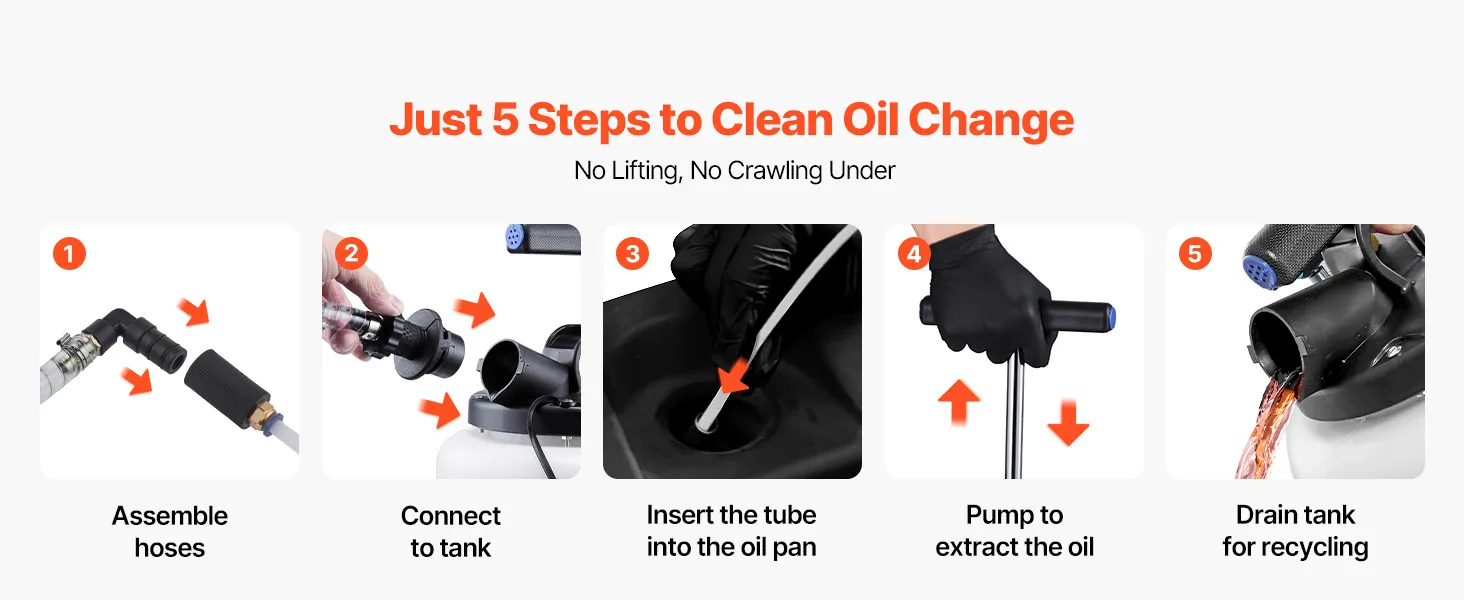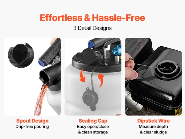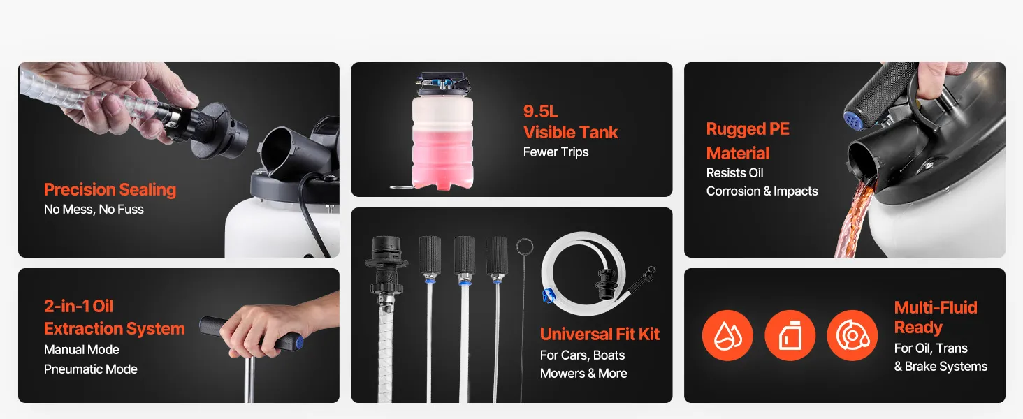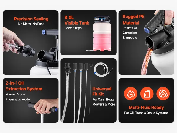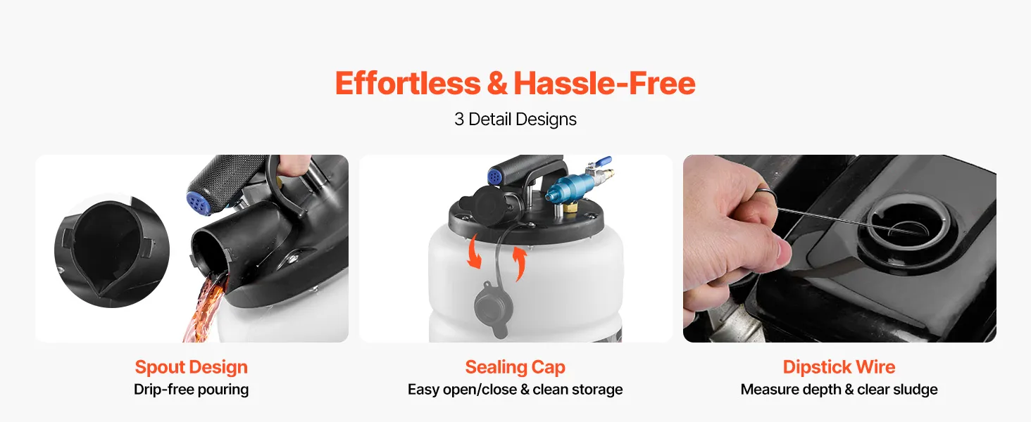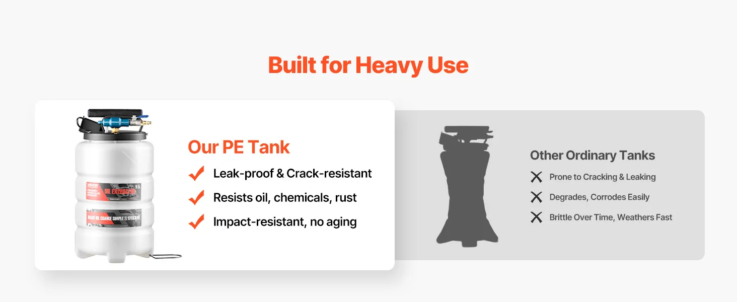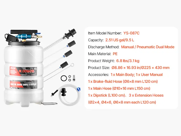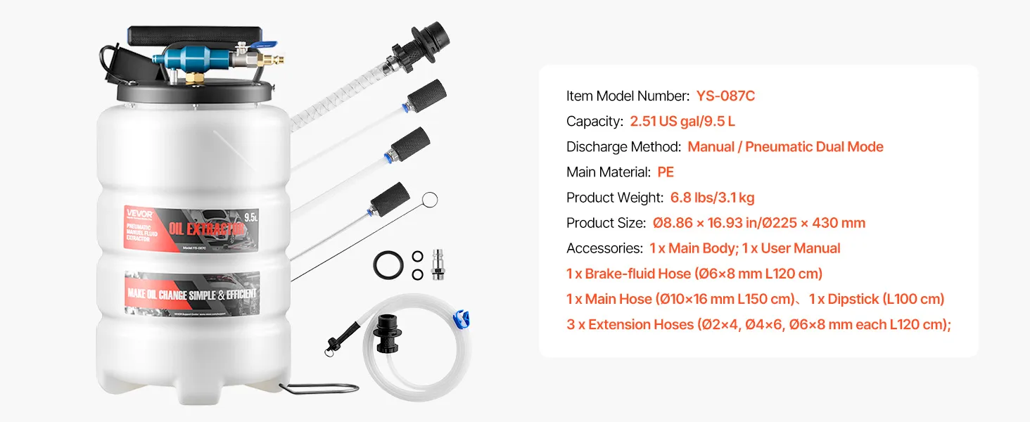 9.5 L Durable Tank: This semi-transparent PE reservoir of the dipstick oil extractor resists corrosion and aging. You monitor levels at a glance, run longer between empties, and tackle frequent use with confidence