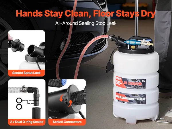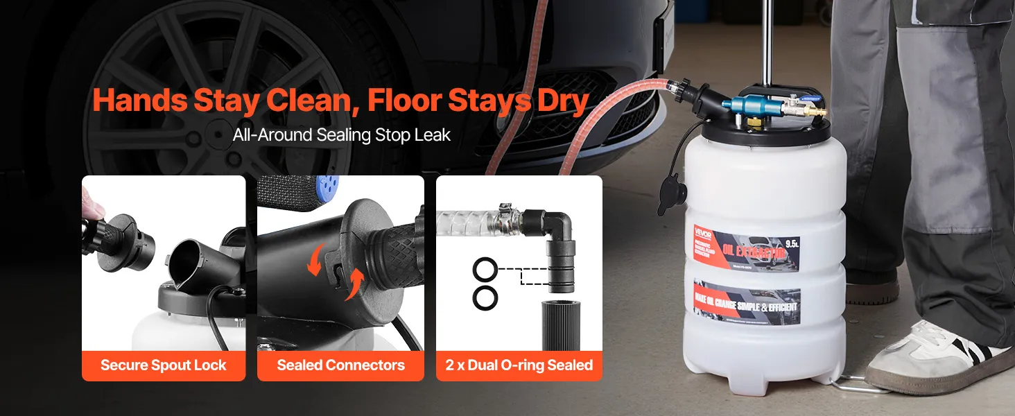Air-Tight, No-Drip Seal: This fluid extractor uses a one-piece tank, precise O-rings, and sealed fittings to lock in air, cut leaks at ports and the base, and keep your workspace clean from start to finish