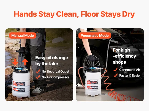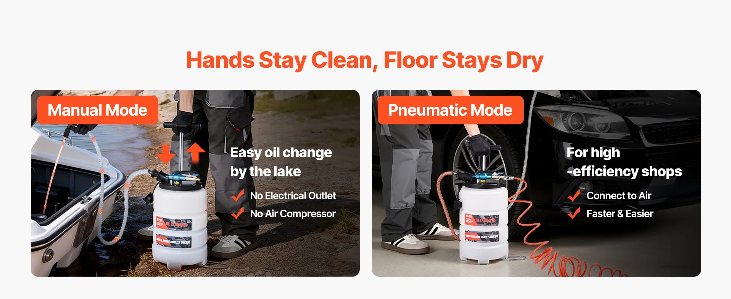 Manual/Pneumatic Switch: This oil extractor pump runs manual vacuum for grab-and-go jobs, or connects to an air compressor to switch into pneumatic mode and keep high-demand workflows moving efficiently