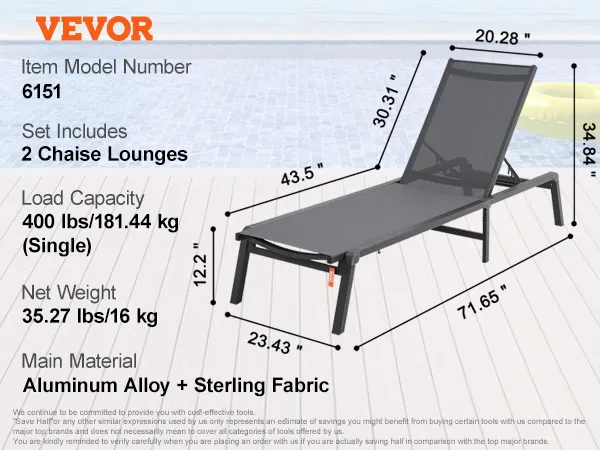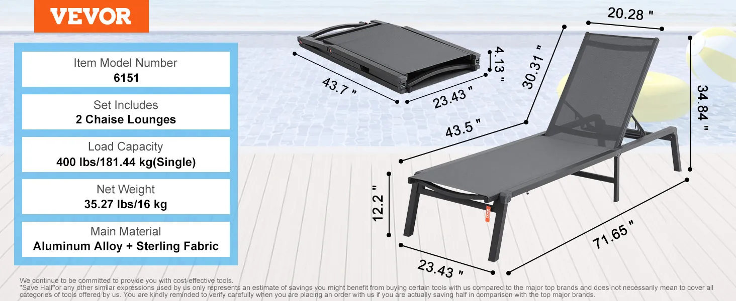 Our chaise lounge chair features a durable aluminum alloy frame that can support up to 400 pounds of load capacity. The net weight is 35.27 lbs, which ensures stability while maintaining the chair's portability. It has folded dimensions of 43.7 x 23.43 x 4.13 in, so you can store it when not in use.