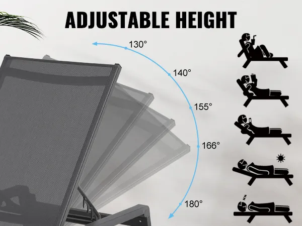 This outdoor patio lounge chair allows you to be versatile and comfortable with the 5-position adjustable backrest. Whether reading a book, sunbathing, or napping, the adjustable feature helps you find the perfect angle for your relaxation needs. The breathable fabric provides a comfortable seating experience, keeping you cool and dry even on the hottest days.