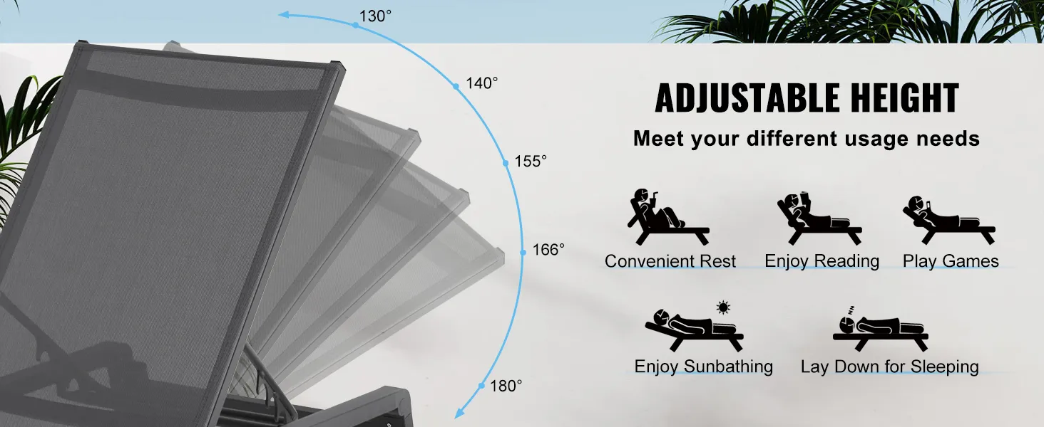 It is perfect for different outdoor settings. This chair adds a touch of comfort and style to your patio, garden, poolside, beach, or balcony. With two pieces in the set, you can create a cozy seating area for you and your partner. Elevate your outdoor experience with the VEVOR chaise lounge chair.
