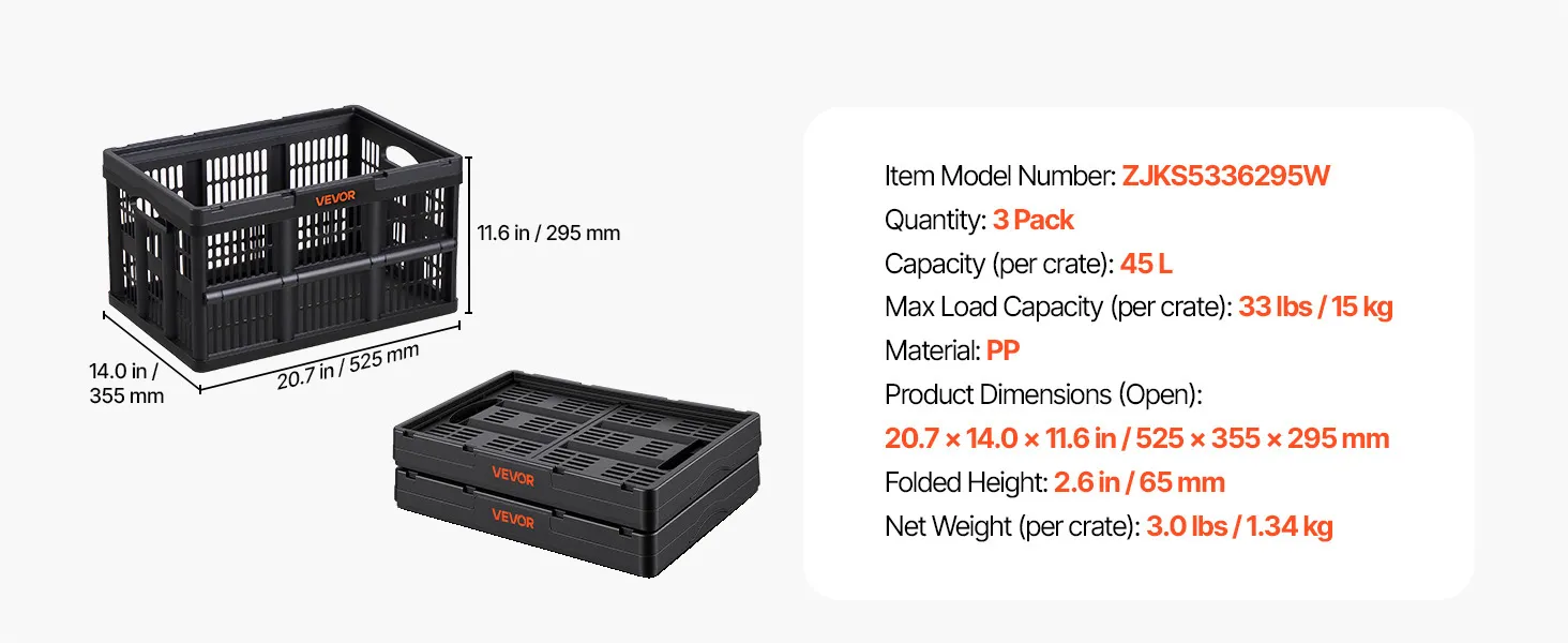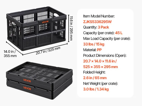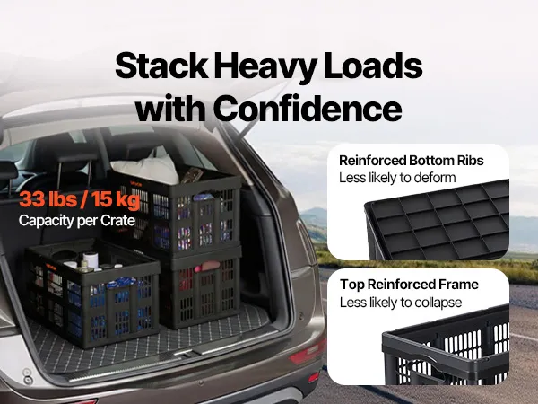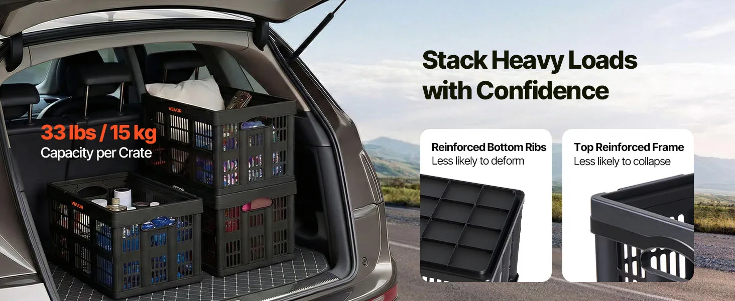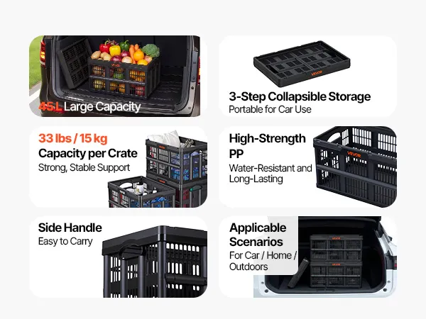 These collapsible crates are built for home organization, car storage, and outdoor travel. Each crate securely supports up to 33 lbs / 15 kg and stacks securely whether open or folded. Fold down easily to save space. Side handles make lifting easy, while high-strength PP construction resists impact.