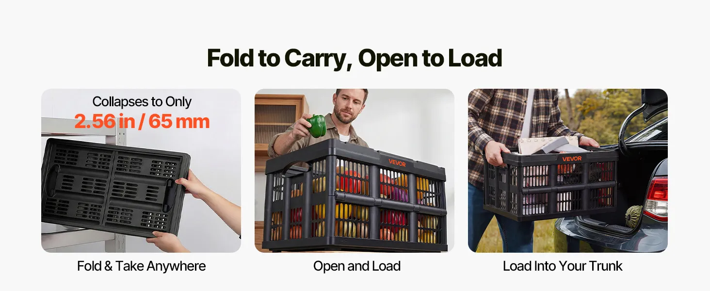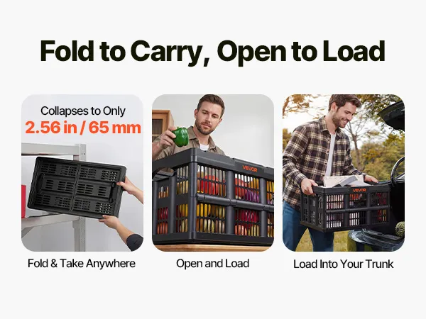 Space Saving Fold: Folds down to just 2.6 in / 65 mm in one quick step. These stackable storage crates store flat in corners or car trunks without taking up valuable space