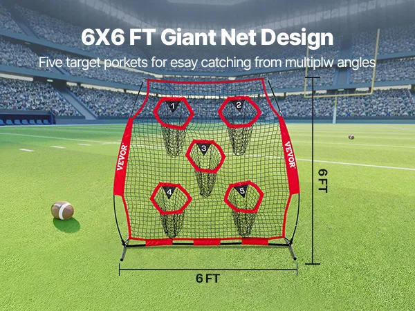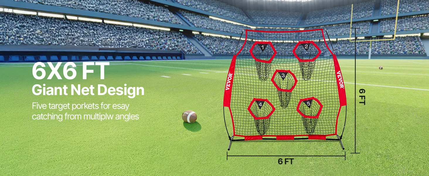 The football training target net comes equipped with a 6x6-foot large net and 5 target pockets, ensuring you can throw the ball from various directions and distances.