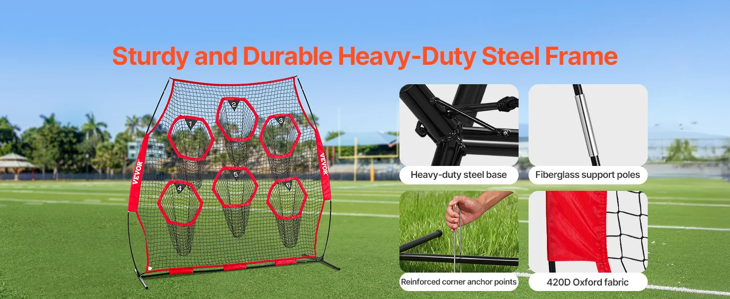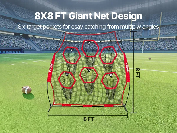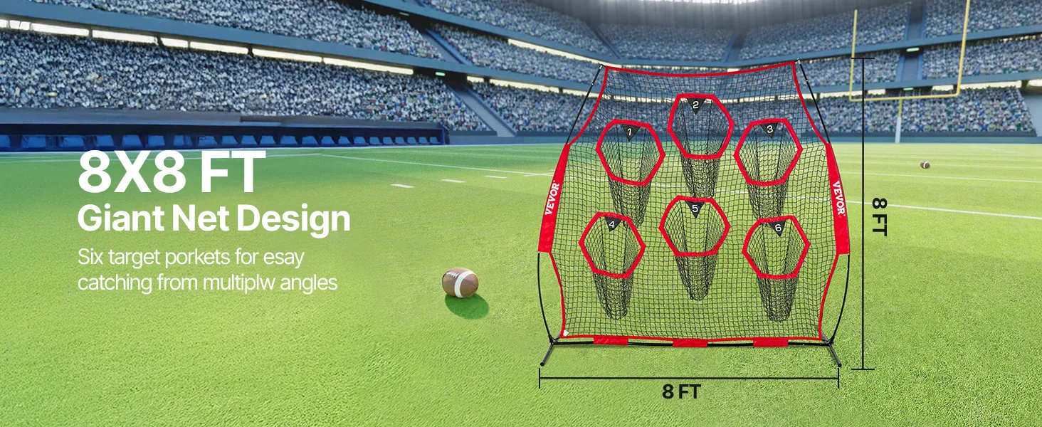 The football training target net comes equipped with a 8x8-foot large net and 5 target pockets, ensuring you can throw the ball from various directions and distances.