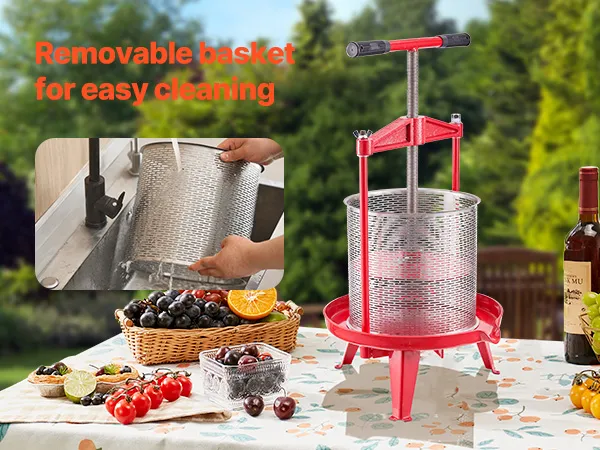 Sturdy Construction: Built with a solid cast iron crossbeam, the fruit wine press can swing open, making it convenient to load the basket or place fruits directly inside. The triangular base ensures stability and secure placement on the ground. Comes with two food-grade filter bags, ensuring secure and hygienic use