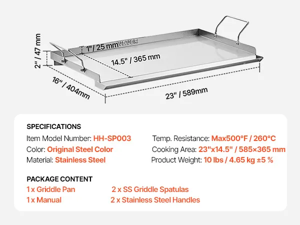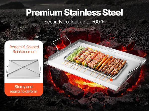 Quality Stainless Steel: Made from durable stainless steel, this griddle for gas grill can handle temperatures up to 500℉, giving you the freedom to cook at high heat. The bottom x-shaped reinforcement resists to deform