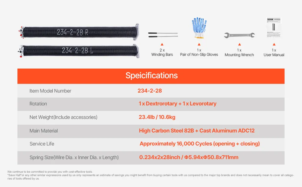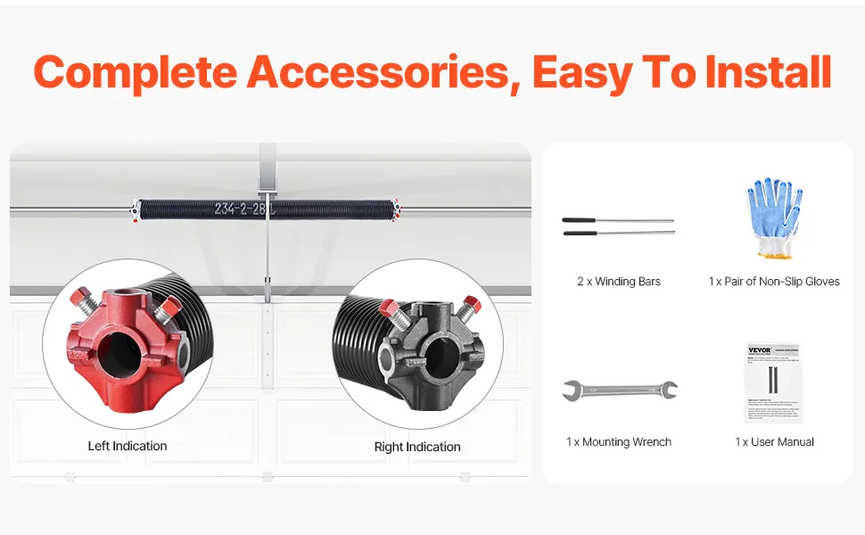 Complete Accessories: All the necessary accessories are included - 2 garage door springs (1 left and 1 right), 2 winding bars, a pair of anti-slip gloves, a mounting wrench, and a user manual