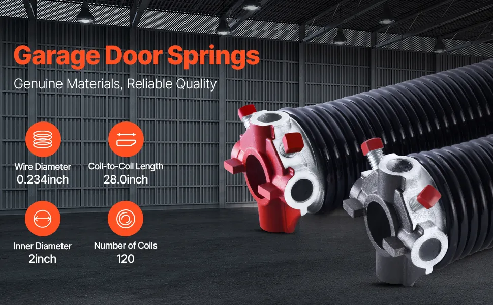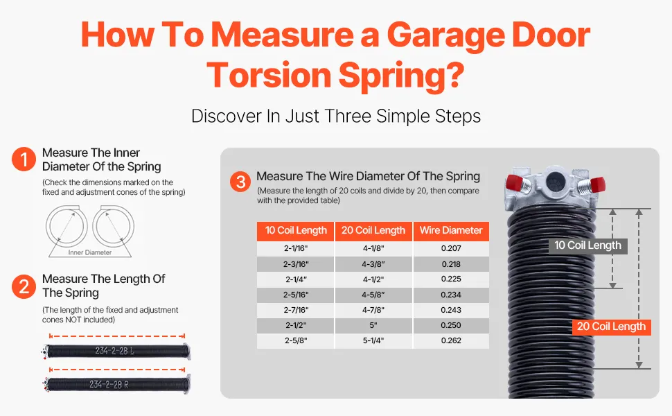 Specifications and Dimensions: Wire Diameter: Φ0.234 inch / 5.94 mm; Inner Diameter: Φ 2inch / 50.8mm; Number of Coils: 120; Length: 28.0 inch / 711 mm. Please confirm that the wire diameter and length are identical to your original garage door torsion springs for time-saving replacement