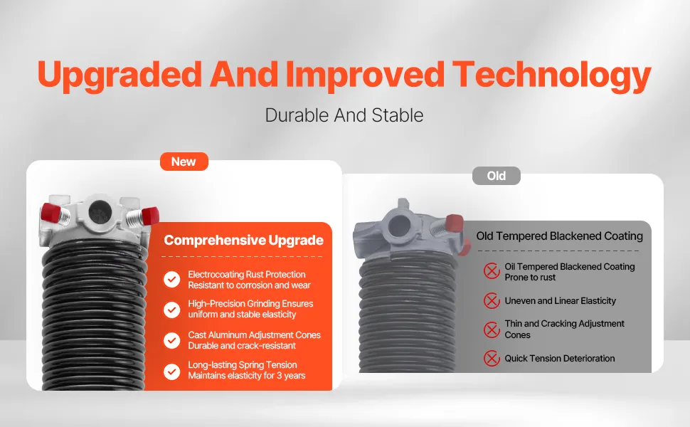 Sturdy and Durable: Our garage door springs are made of professionally heat-treated spring steel coils and aluminum cones. With advanced electrocoating surface treatment, they boast excellent corrosion resistance and wear resistance, eliminating the need for additional lubrication and providing a longer lifespan