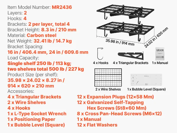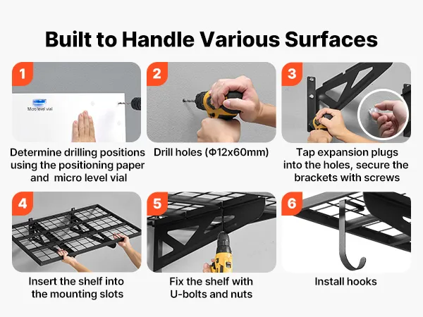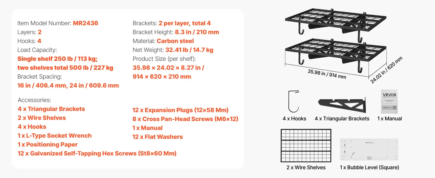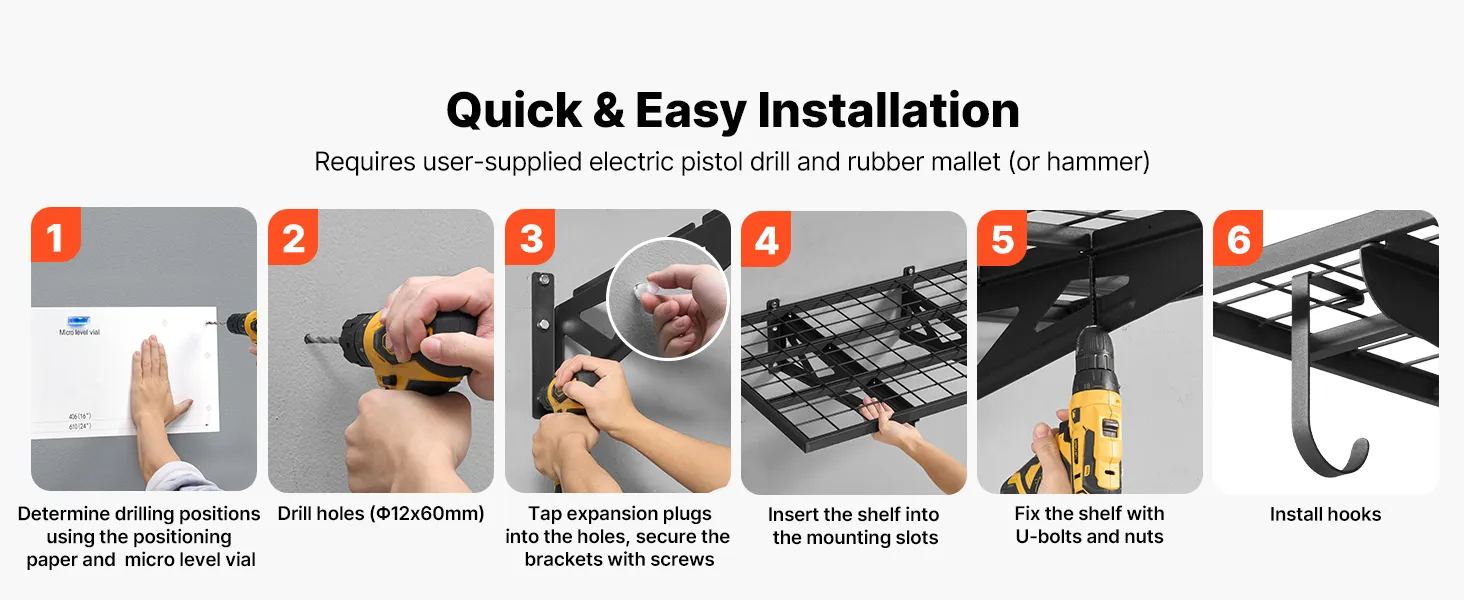 The package of the garage hanging shelves includes a positioning template and a level to help mark drilling points accurately. The simple installation steps make setup straightforward, even for first-time installers.