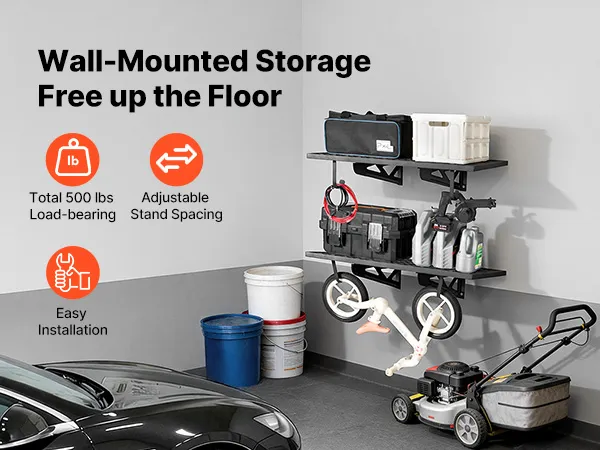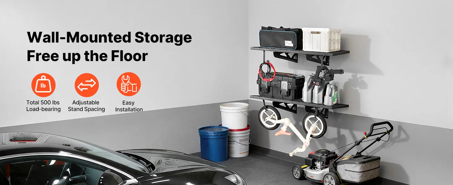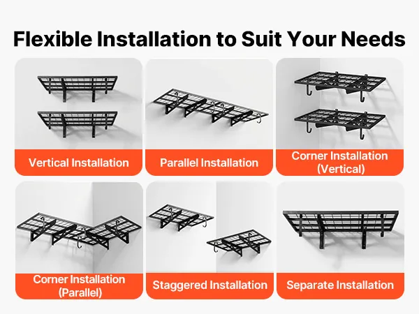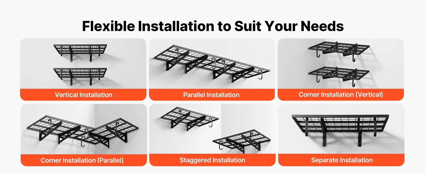 This wall mounted garage shelving supports vertical, parallel, corner, staggered, or single-shelf installation. You can choose the layout that fits your storage needs and make the most of every wall section.