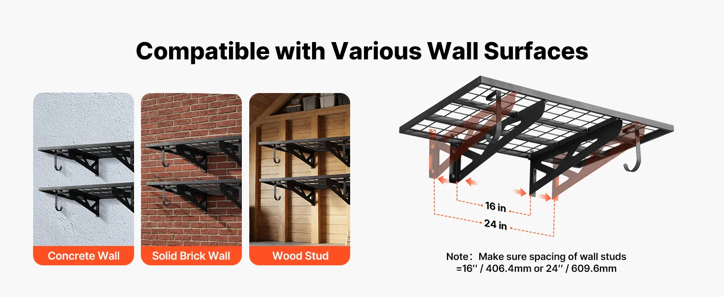 Fits Many Wall Types: This wall mounted garage shelving adjusts to 16 in or 24 in stud spacing. The design installs on concrete, solid brick, or wood studs, making setup flexible for different spaces.