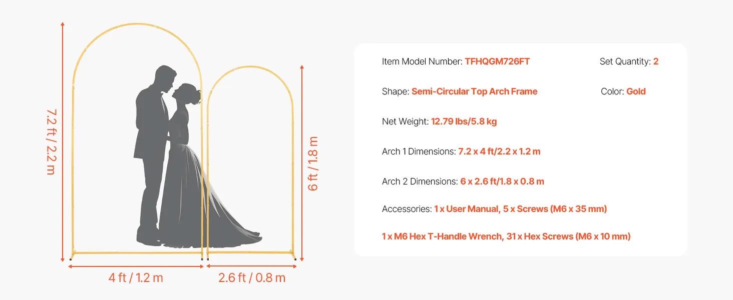 Elegant Design: This 2-set arch backdrop stand, with dimensions of 7.2 x 4 ft and 6 x 2.6 ft, is suitable for both indoor and outdoor use. It enhances the visual appeal, creating a unique romantic atmosphere for any celebration