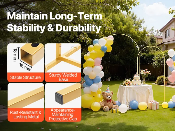 Featuring 0.71 x 0.71 in/18 x 18 mm metal square tubes, our metal arch backdrop stand is rust-resistant and non-bending for lasting use. With a reinforced welded base, it enhances stability. It also adds a foot cap, which is both beautiful and dust-resistant, suitable for indoor and outdoor use.