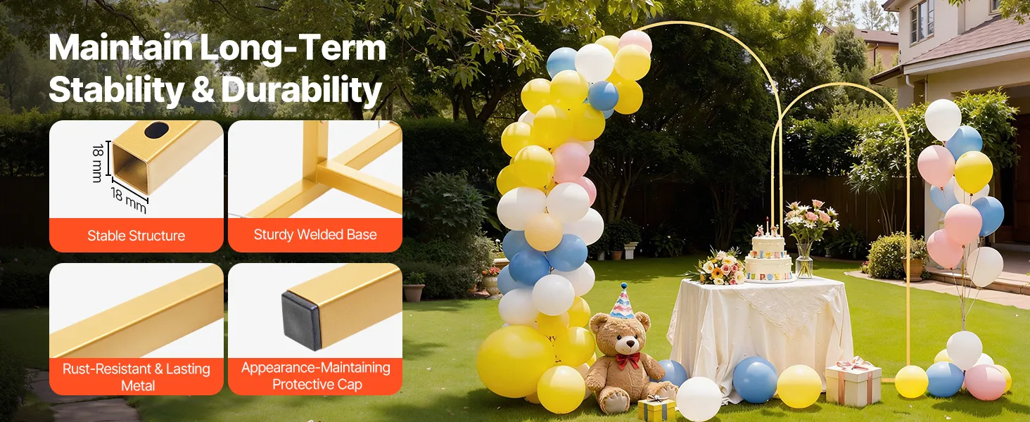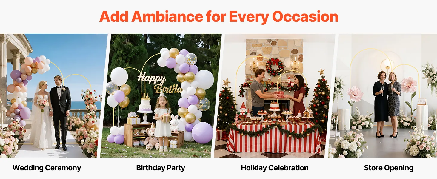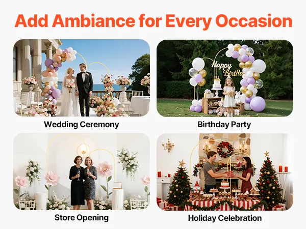Versatile Use: Ideal for weddings, parties, holiday celebrations, or store opening decorations, the metal arch stand allows flexible decoration with balloons, flowers, tulle fabric, LED lights, and more. (NOTE: Decorations are not included)