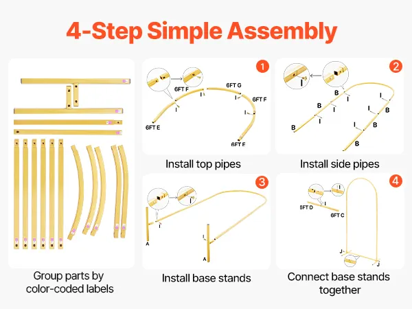 Easy Assembly: Our gold arch backdrop includes an instruction manual to show each step of the installation clearly. Each part is numbered and color-coded to correspond with the manual, making grouping and assembly simple without stress