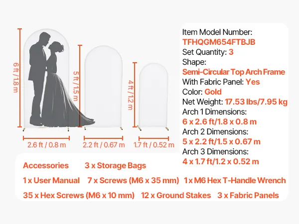 VEVOR Arch Backdrop Stand, Set of 3, 1.8/1.5/1.2 m, Stable Structure, Easy Assembly, Gold Metal Arch Backdrop Stand with Cover, for Wedding, Birthday Party, Celebration, and Ceremony Decoration