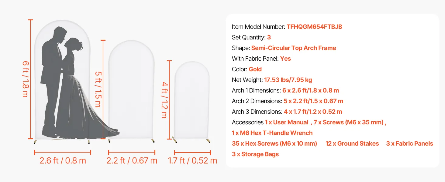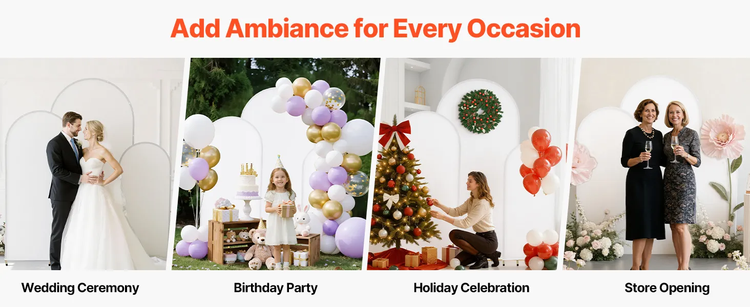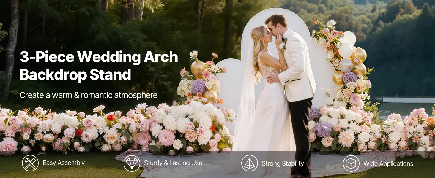 Elegant Design: This 3-set arch backdrop stand, with dimensions of 6 x 2.6 ft, 5 x 2.2 ft, and 4 x 1.7 ft, is suitable for indoor and outdoor use. It enhances the visual appeal, creating a unique romantic atmosphere for any celebration
