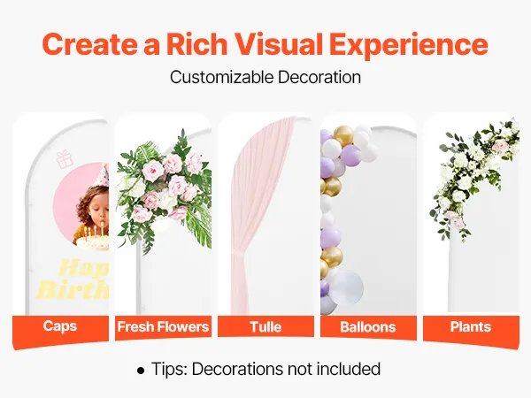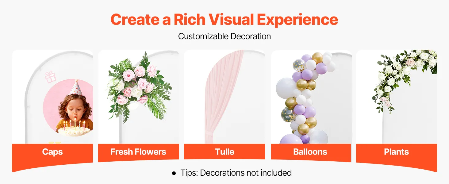 Versatile Use: Ideal for weddings, parties, celebrations, or opening decorations, the metal arch stand allows decoration with balloons, flowers, tulle fabric, and etc. (NOTE: Storage bags and fabric panels are included; decorations are not)