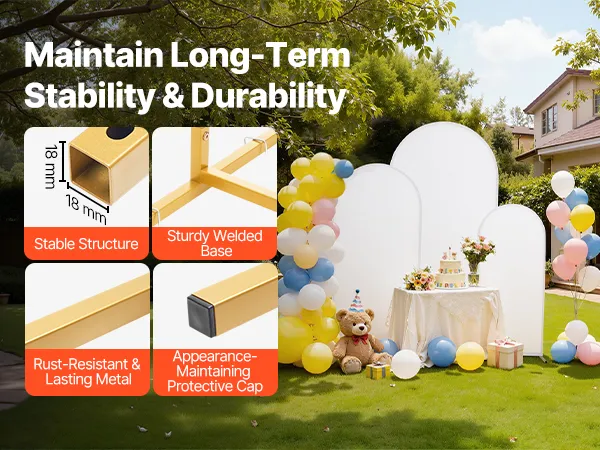 Featuring 0.71 x 0.71 in/18 x 18 mm metal square tubes, our metal arch backdrop stand is rust-resistant and non-bending for lasting use. With a reinforced welded base, it enhances stability. It also adds a foot cap, which is both beautiful and dust-resistant, suitable for indoor and outdoor use.