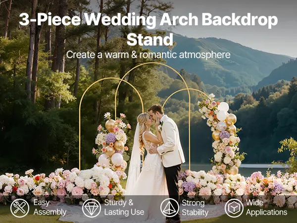 This 3-set arch backdrop stand is easy to assemble. Featuring a metal frame, it ensures stability and long-lasting use. Ideal for both indoor and outdoor occasions, it helps create a warm and romantic atmosphere effortlessly.