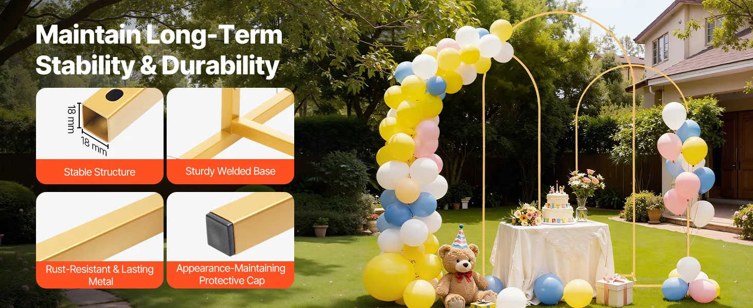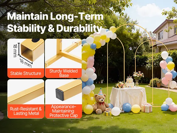 Featuring 0.71 x 0.71 in/18 x 18 mm metal square tubes, our metal arch backdrop stand is rust-resistant and non-bending for lasting use. With a reinforced welded base, it enhances stability. It also adds a foot cap, which is both beautiful and dust-resistant, suitable for indoor and outdoor use.