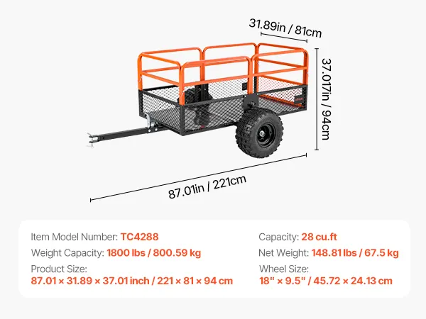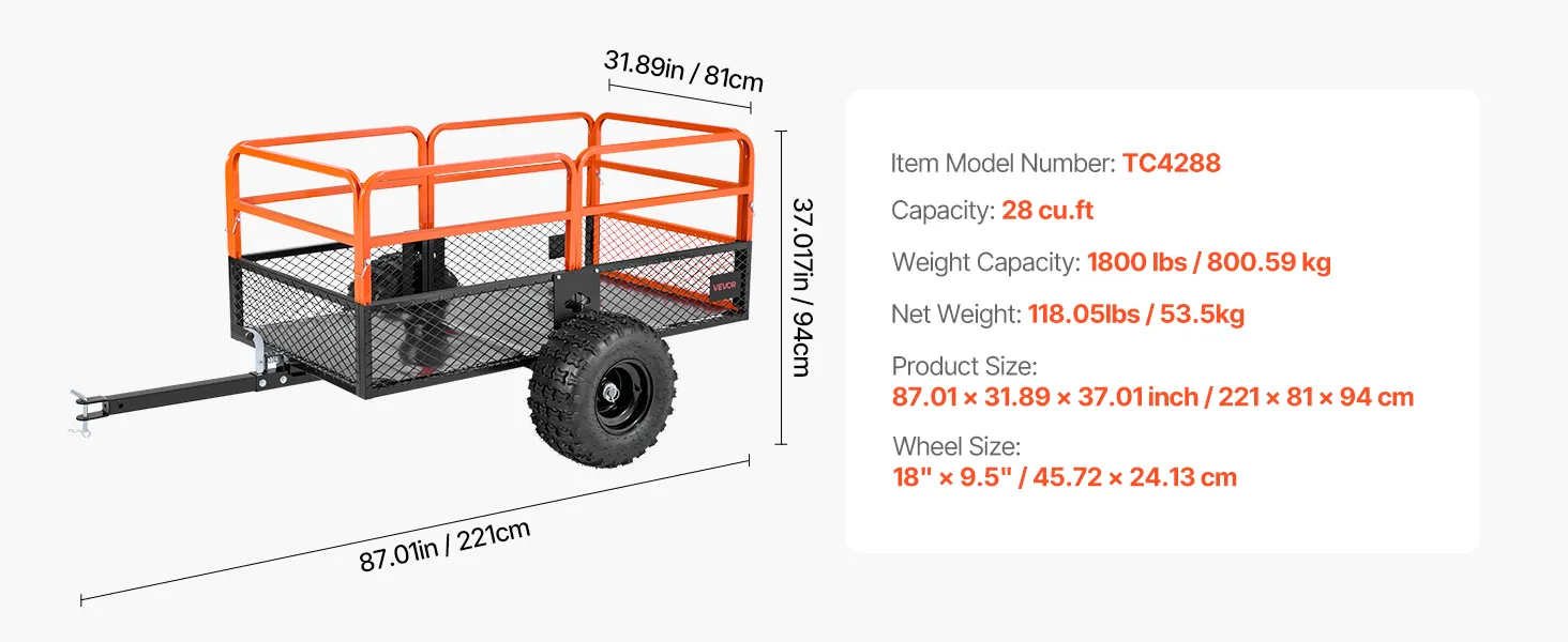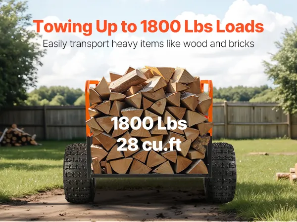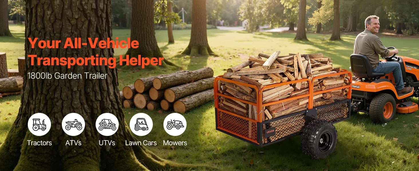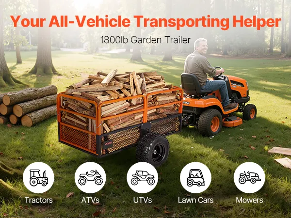 This 1800lb garden trailer fits tractors, ATVs, lawnmowers, and more. With a steel frame, rust-resistant coating, reinforced support rods, and pneumatic tires, it offers a 1800lb capacity and 18 cu.ft. of space. The 28" tires ensure smooth movement over grass and mud, for gardening and cleanup.