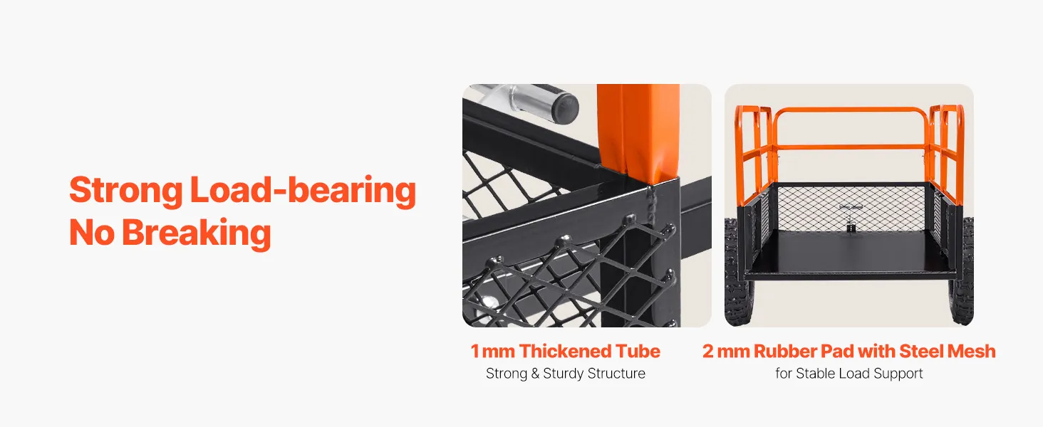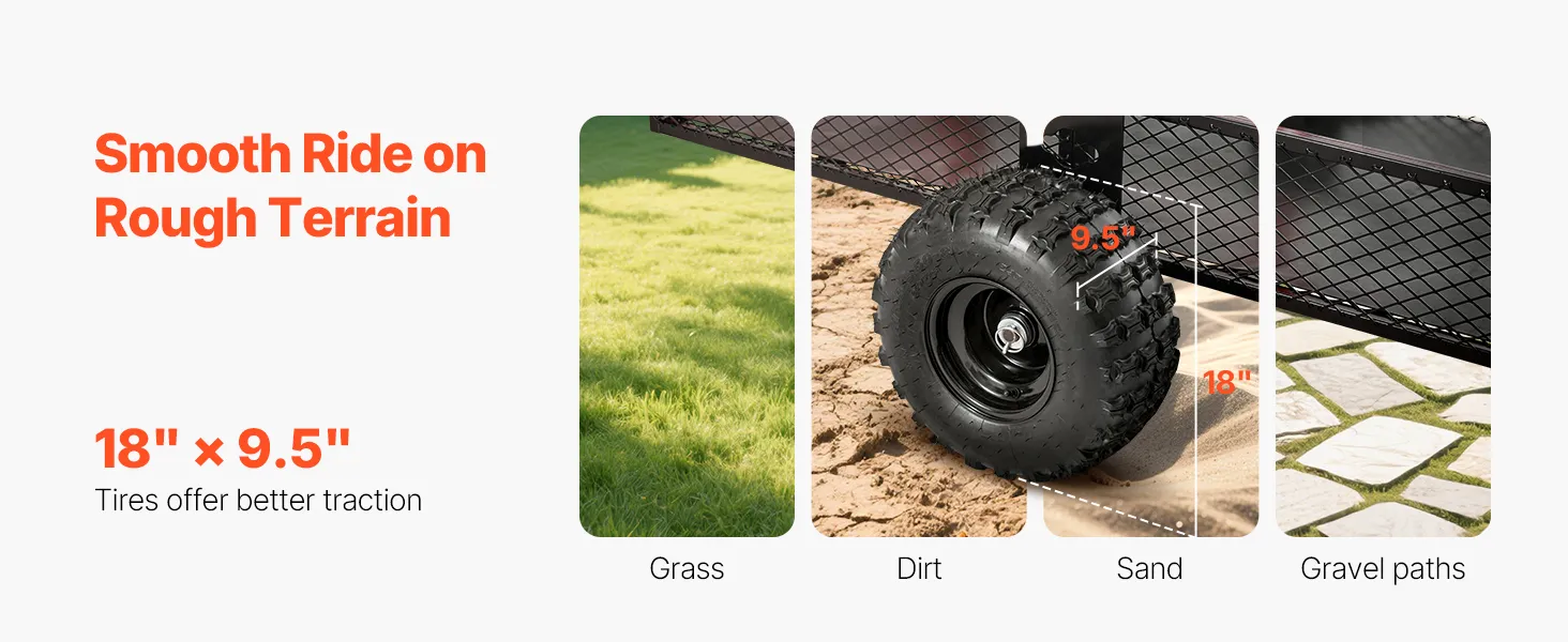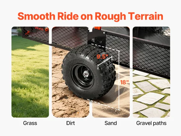 Adaptable to Rough Terrain: Featuring 18"×9.5" pneumatic tires, this steel garden cart provides excellent traction on grass, mud, sand, and gravel. The inflatable tires, combined with a reinforced powder-coated axle, ensure smooth movement on uneven surfaces, offering durability and reliability.