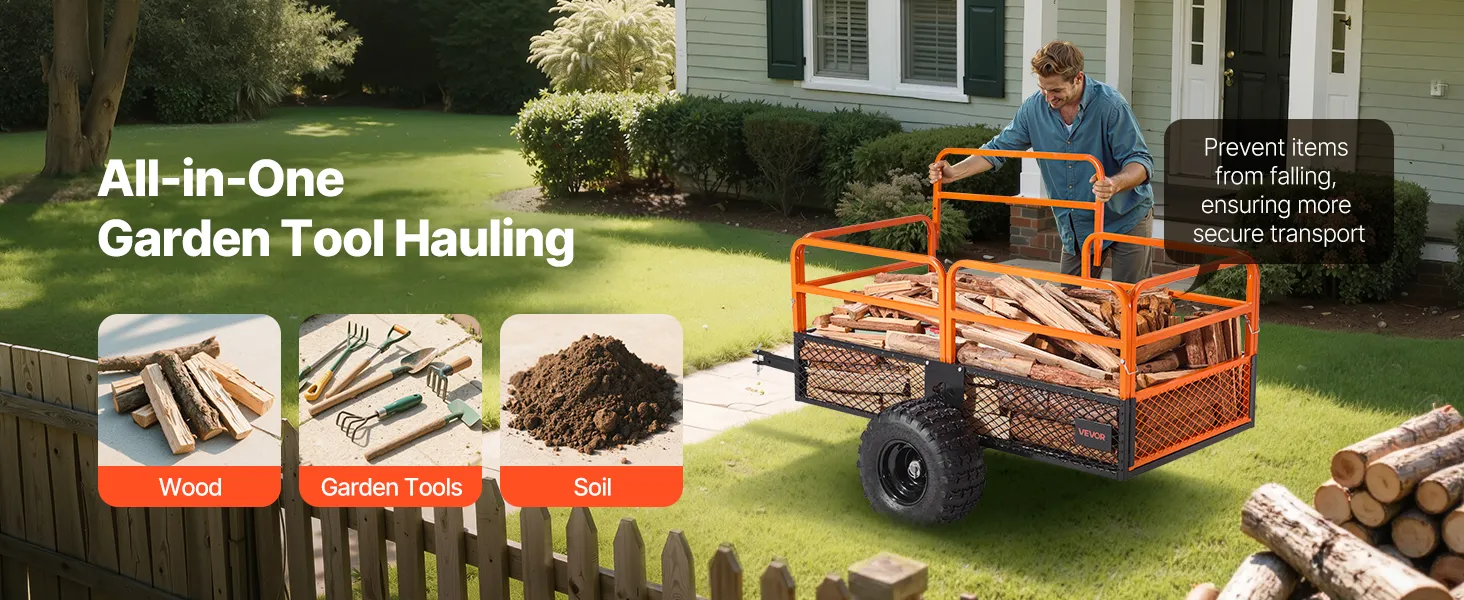 With a 28 cubic feet capacity, this garden cart is ideal for hauling gardening tools, wood, and soil. The three-sided guardrails prevent items from falling out, ensuring safe and easy transport for both large-scale gardening and routine maintenance.