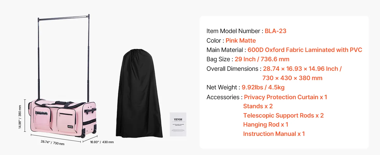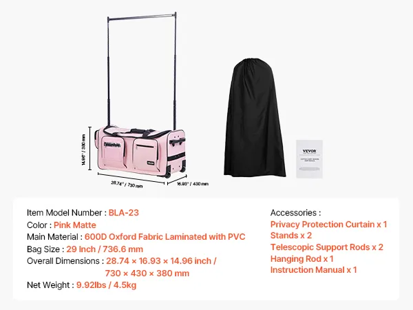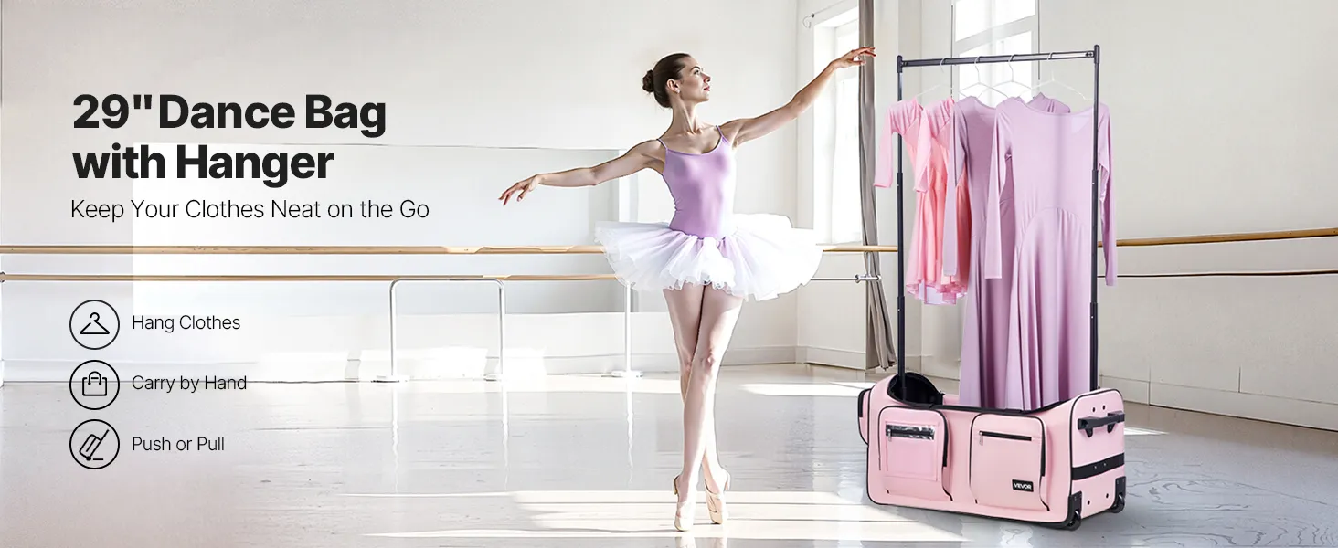 VEVOR Dance Bag with Garment Rack, 29 Inch Rolling Dance Duffel, with Wheels, USB Port, Height Adjustable Clothes Rack, Privacy Protection Curtain, Ideal for Travel and Competitions, Matte Pink
