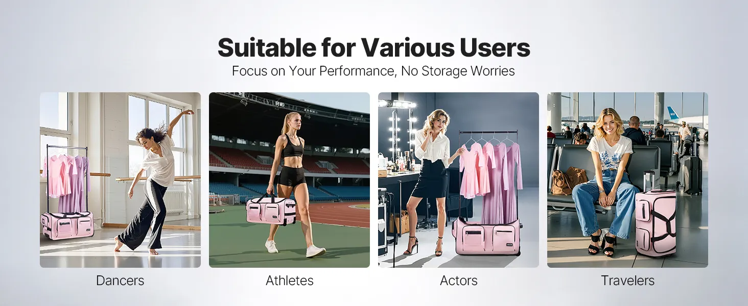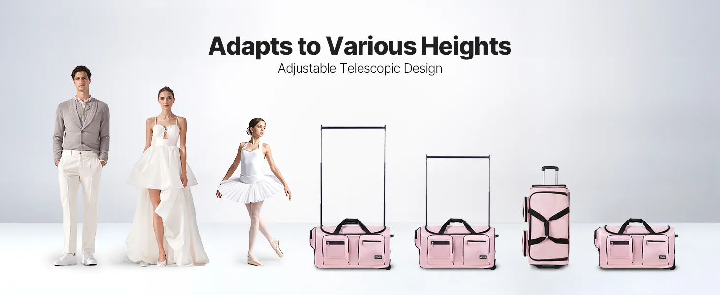 Anti-Tilt Garment Rack: A dance bag with garment rack that adjusts to two heights—35.43 inch / 90 cm and 57.09 inch / 145 cm—ideal for users of various heights. Hand-carry or roll it with ease for effortless competition days
