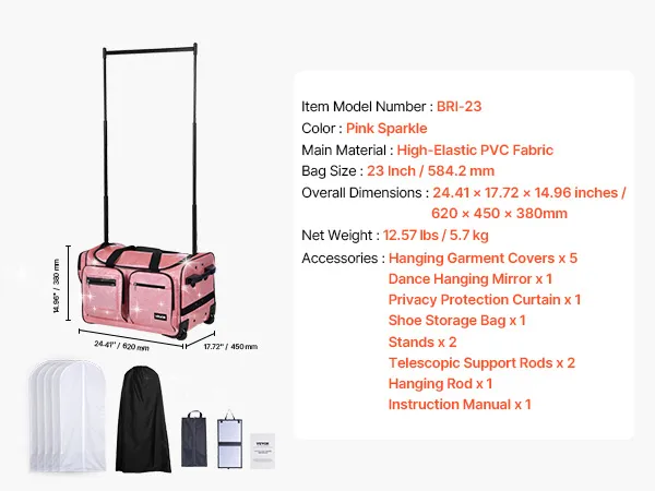VEVOR Dance Bag with Garment Rack, 584.2 mm Rolling Dance Duffel, with Wheels, USB Port, Height Adjustable Clothes Rack, Privacy Protection Curtain, Ideal for Travel and Competitions, Sparkling Pink