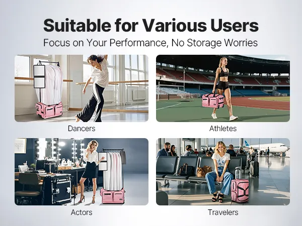 Anti-Tilt Garment Rack: This dance bag with garment rack features an adjustable height (35.43 inch / 90 cm and 57.09 inch / 145 cm), suitable for various heights, and it can be hand-carried or rolled to facilitate your dance competition