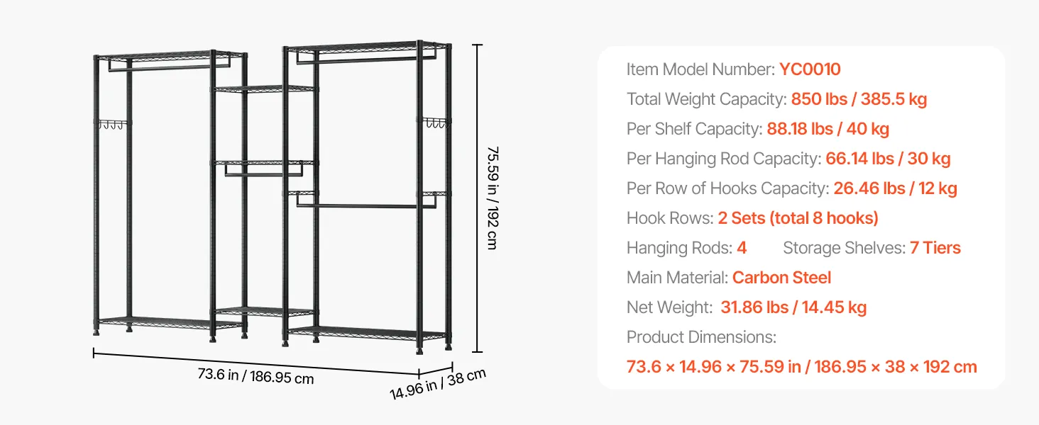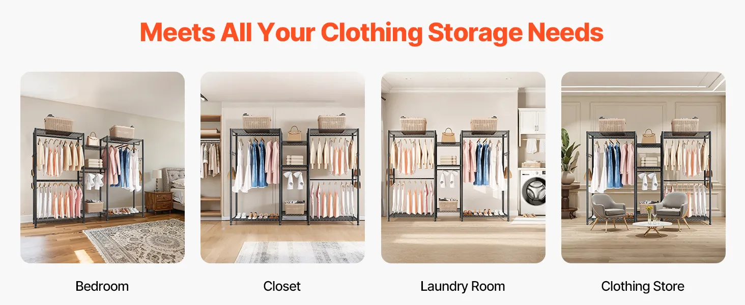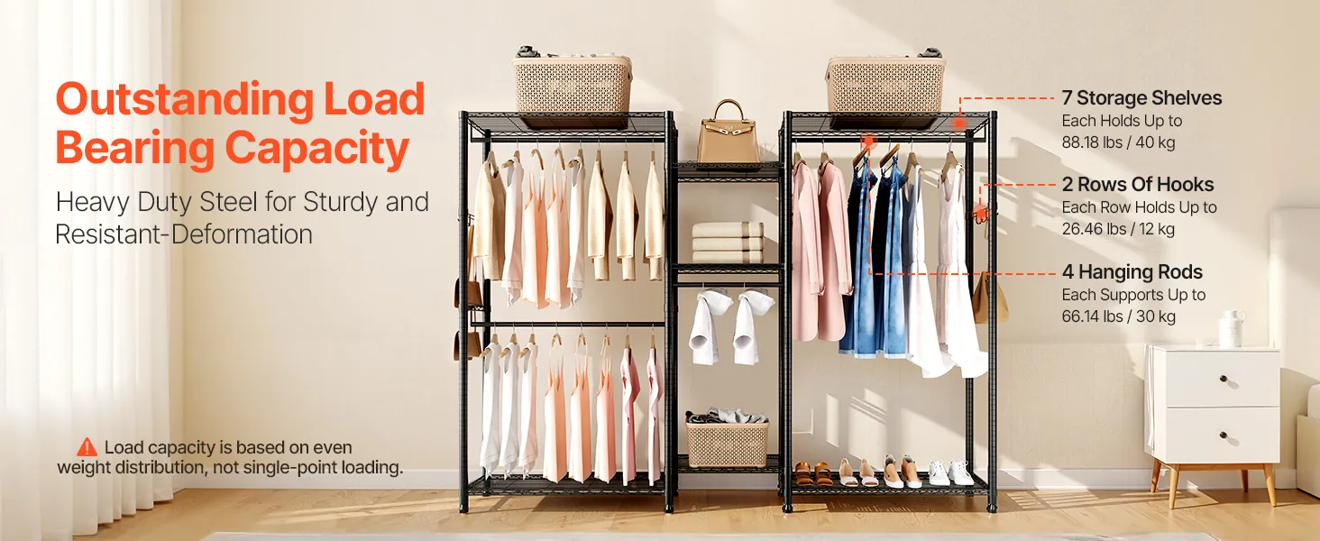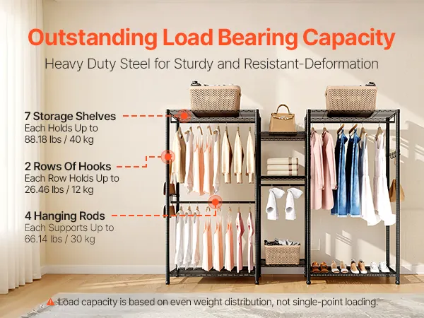 Sturdy Construction: Made of thickened carbon steel, this clothes rack supports up to 850 lbs / 385.5 kg, handling the weight of various clothing and accessories. The rust- and corrosion-resistant powder-coated finish protects against daily scratches and wear