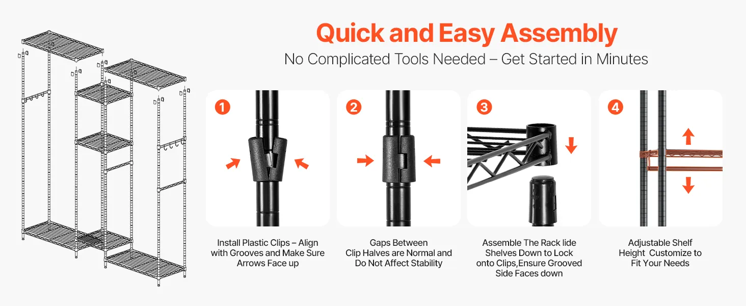Easy Assembly: This hanging clothes rack features a slide-and-lock design for hassle-free installation. With simple steps, you can install plastic clips and storage shelves. For secure fit, we recommend tapping the shelves with a rubber mallet (not included)