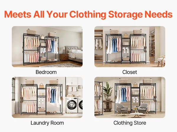 With a sleek and classic black finish, this heavy duty clothes rack fits effortlessly into any setting. Ideal for bedrooms, walk-in closets, laundry rooms, or retail stores, it adds elegance while meeting diverse storage needs.