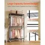 This rolling clothes rack provides ample storage space and is built from heavy-duty carbon steel for strength and durability. 360° wheels allow easy mobility. Adjustable shelves accommodate clothing and items of various sizes, making storage effortless and convenient.